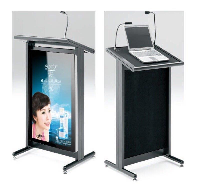 Podium modular para conferencias, es un sistema portatil permitiendole al cliente la comodidad para sus labores, le permite colocar una imagen corporativa a traves de un banner o una pantalla.